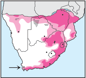 Usually found in groups on 'fynbos'-covered hillsides (including suburbia in coastal regions), 'Karoo' hills and montane foothills.