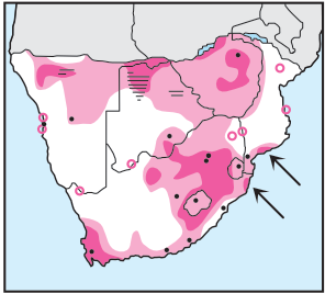 Occurs all year in northern Botswana and KwaZulu-Natal coastal plains. Small 'flocks' or pairs forage over 'grassland', breeding in river banks and termite mounds.