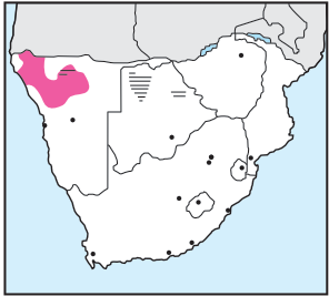 Found in arid 'mopane' woodland in northwestern Namibia, frequenting dry watercourses and hillsides with trees.