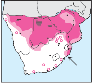 Fairly common, localised resident. A distinctive, bulky-looking black eagle with red facial skin and legs and tawny wing coverts. Female has tawny secondaries. The back is normally chestnut-brown, less often creamy white. In flight appears almost tailless. Wing-tips curl upward, long wings are tapered (broadest on middle secondaries); male has widest black trailing edge; see flight pattern. Immature has longer tail and progresses from (1-5yr) from uniformly dull brown with slaty face and legs to brown mottling with purple face and legs; reaching maturity in year 6-7, see also flight patterns. In flight may call a loud ‘schaaaaaaaw’; while perched often calls ‘kau-kau-kauko-aaagh’. Sometimes makes wing-claps in the air. Often first to detect carcasses but are submissive to vultures and can be robbed by Tawny eagles of food. Normally flies at low altitude over bushveld and woodland, using little wing-flapping; glides for long periods with a sideways rocking action as though balancing. Nests of sticks in large Acacia or Jackalberry trees. Feeds by scavenging or hunting small mammals, reptiles and birds. 1,7-2,7 kg.