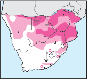 Small, robust birds with straight, pointed bills, stiff tails and zygodactylous feet (the inner and outer toes are directed backward and the two central toes forward). They glean insects and their larvae from within crevices in trees and from beneath bark by tapping with their bills to loosen or chip the wood and inserting their long sticky tongues. While feeding, they use the tail as a prop. They normally occur in pairs and excavate holes in trees for nesting, these frequently being used in turn by other hole-nesting species. Many woodpeckers are very similar in appearance. They are best identified by head and breast markings plus call. The aberrant Ground Woodpecker is entirely terrestrial and nests in holes in banks.