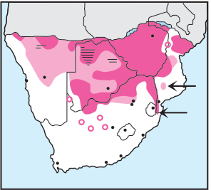 Small, robust birds with straight, pointed bills, stiff tails and zygodactylous feet (the inner and outer toes are directed backward and the two central toes forward). They glean insects and their larvae from within crevices in trees and from beneath bark by tapping with their bills to loosen or chip the wood and inserting their long sticky tongues. While feeding, they use the tail as a prop. They normally occur in pairs and excavate holes in trees for nesting, these frequently being used in turn by other hole-nesting species. Many woodpeckers are very similar in appearance. They are best identified by head and breast markings plus call. The aberrant Ground Woodpecker is entirely terrestrial and nests in holes in banks.