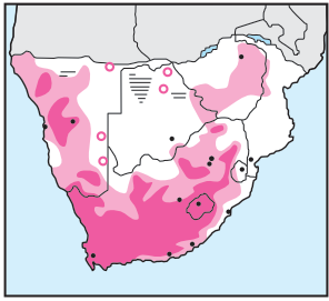 Occurs singly, in pairs or in 'flocks' in a variety of semi-arid, coastal montane regions, coastal sand dunes with sparse scrub, rocky hillsides in the 'Karoo' and Zimbabwe, 'broad-leaved woodland' in Zimbabwe plus suburbia in many regions.