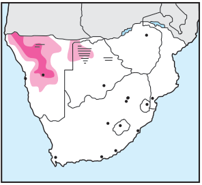 Frequents thornveld in the arid northwestern regions of Namibia and Botswana.