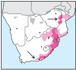 Occurs mostly in moist 'savanna', around villages, near cultivation and at 'forest' fringes; decidedly uncommon (as is its host) in drier bushveld regions.
