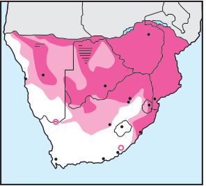 Pairs occur in 'broad-leaved woodland', thornveld and bush fringing dry river beds.