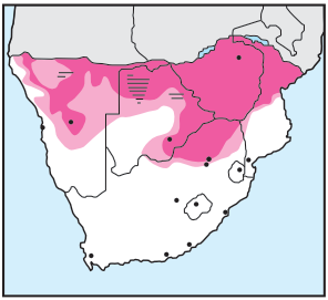 Occurs singly or in pairs in dry thickets in thornveld, woodland and especially bush-covered termitaria.