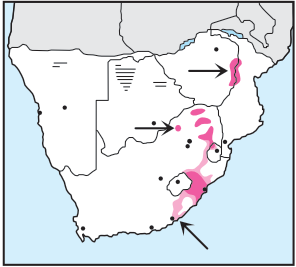 Eastern mountain slopes with proteas and aloes. Rufous breast and cap.