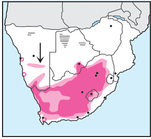 Common in the Karoo and very common in highveld regions, where it frequents parks and gardens.