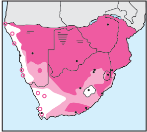 Solitary in a variety of wooded habitats, preferring mixed bushveld and thornveld; most common in the central Kalahari.