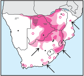Considered distant relatives of starlings and endemic to sub-Saharan Africa. They have very sharp claws for clinging to large mammals. They use their bills to comb the animal's fur for ticks and bloodsucking flies. Their diet also includes the blood and mucus of host animals; they will keep pecking at a wound to encourage blood flow. Oxpeckers' presence may reduce the time spent grooming by mammalian hosts by as much as a third. Their tails are used as props in woodpecker fashion as they clamber all over their hosts.