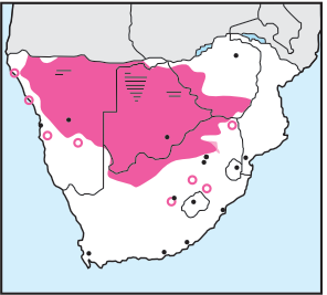 Common, endemic resident. Entirely white except for black wings and tail. Immature is initially olive-brown, becoming white gradually. The call is a high-pitched babbling, one bird commencing ‘skerr-skerr-skerr-kikikikikikerrkerrkerr…’ and all others joining in; shriller than [Arrow-marked Babbler]. Parties of up to 12 birds frequent dry thornveld and woodland.