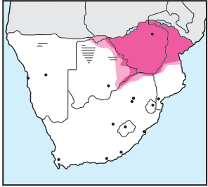 Pairs frequent dense vegetation in 'broad-leaved woodland', dense lowveld bushveld and riverine thickets. Replaces (Southern Boubou) in northern areas, but co-occurs with [Swamp Boubou] in Botswana.
