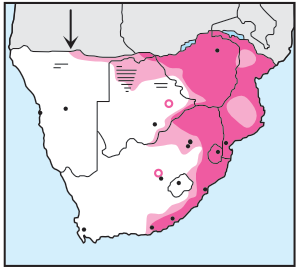 Common resident. Breeding male identified by spotted back and, in the northern race (a), by entirely black head; in the southern race (b) by the clear yellow crown with black only on face and throat; eyes red. Female has yellow breast, white underparts and brown eyes. Non-breeding male like female but retains the red eyes. Breeds in colonies, often large, in thorn trees overhanging water, sometimes in reeds or away from water in exotic trees at farms and in suburbia. Male displays by hanging beneath the nest, swinging from side to side with quivering wings while making husky swizzling sounds. Nomadic in flocks when not breeding.