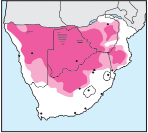 Pairs, often in company with [Blue Waxbill], occur in dry thornveld, especially sandveld. Feeds on the ground, flying into thickets when disturbed.