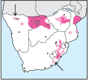 Most frequent in northern 'wetlands' of Botswana and central Mozambique.