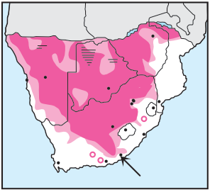 Common resident. Distinguished by bold white eyebrow and, in flight, striking white rump and upper tail coverts. The spotted-breast race (b) is found in Zimbabwe. Sexes are alike; immature has a horn-coloured bill. Call is a harsh ‘chick-chick’; also a loud, rambling song of liquid notes ‘cheeoo-preeoo-chop-chop, cheeoo-trroo-cheeoo-preeoo-chop-chip…’. Pairs and loose flocks occur in dry thornveld, usually near the trees containing their nests. Conspicuous and active, nest-building at all times of year.