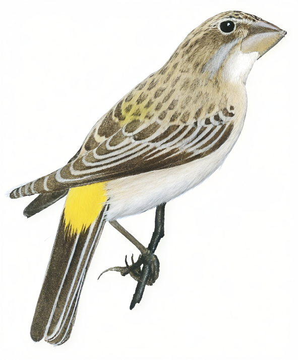 Kalahari and Arid west. Face and throat yellow; crown, hindneck, upperparts and breast pale yellow heavily dappled blackish; belly dusky; vent rufous.